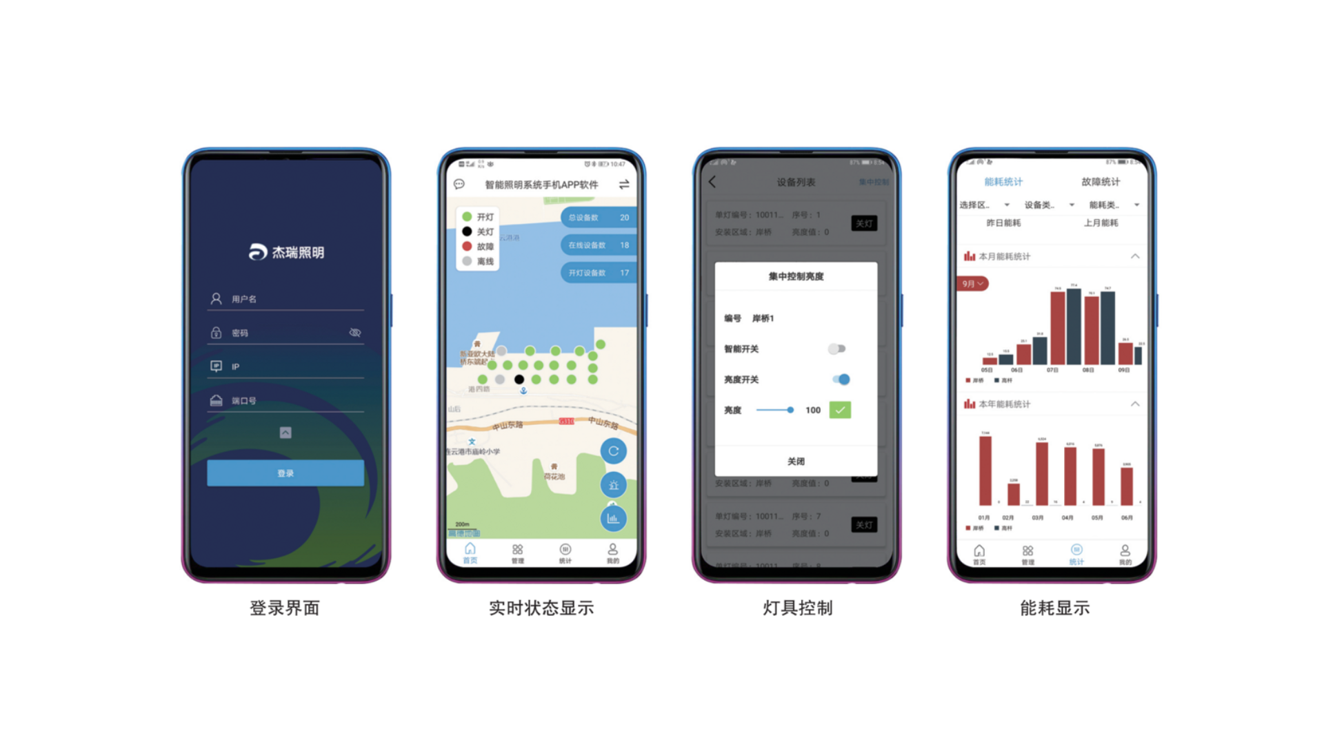 杰瑞智慧照明系统JR-LCS-Smart2000是杰瑞针对港口岸桥和堆场、厂房等作业区域的照明特点,利用云计算、大数据、人工智能、视频检测、嵌入式与物联网等技术设计开发的全新一代自适应智慧照明系统。系统具备智能控制和高效节能两大特点,实时感知作业区域内的人、车、环境,支持与企业生产调度系统对接,实现作业区域内的自适应照明,达到高效节能目的。系统兼具灯具状态实时显示、灯具故障实时推送、能耗大数据实时统计、控灯预案自主可调等多种功能,满足企业对照明系统的精细化管理。系统包含:智能照明管理平台、智能灯具控制器、高稳定性LED灯具(内含单灯控制器)、高精度传感器等一整套软硬件设备,同时拥有桌面Web端和手机端两种管理方式。